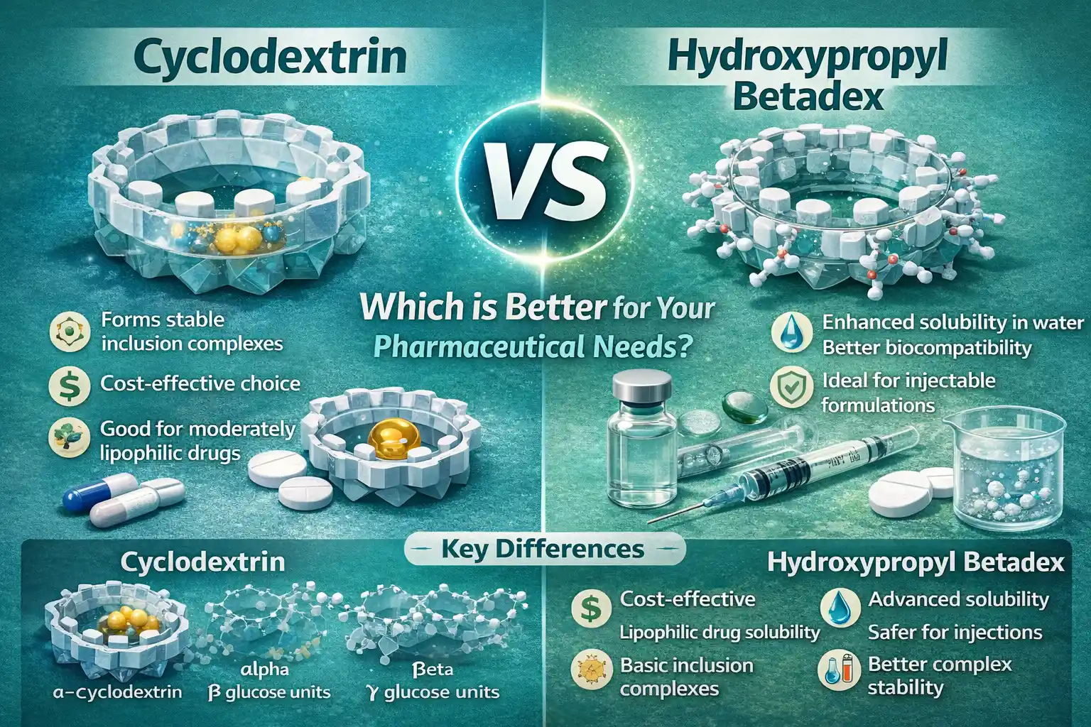 Båda hjälpämnena fungerar bra i formler med kontrollerad frisättning, men de används på olika sätt beroende på läkemedelsindustrins behov. Cyklodextrin kan användas i orala, aktuella och vissa injicerbara former, och hydroxipropylbetadex kan användas för förbättrad parenteral läkemedelstillförsel.